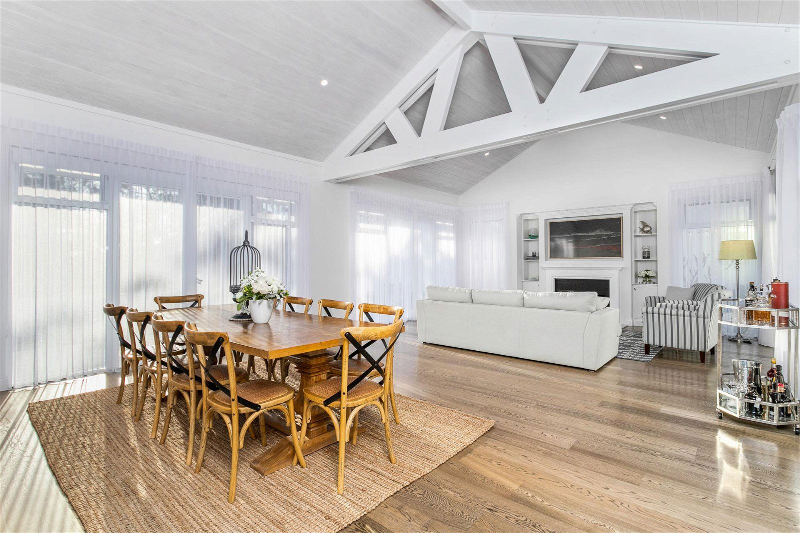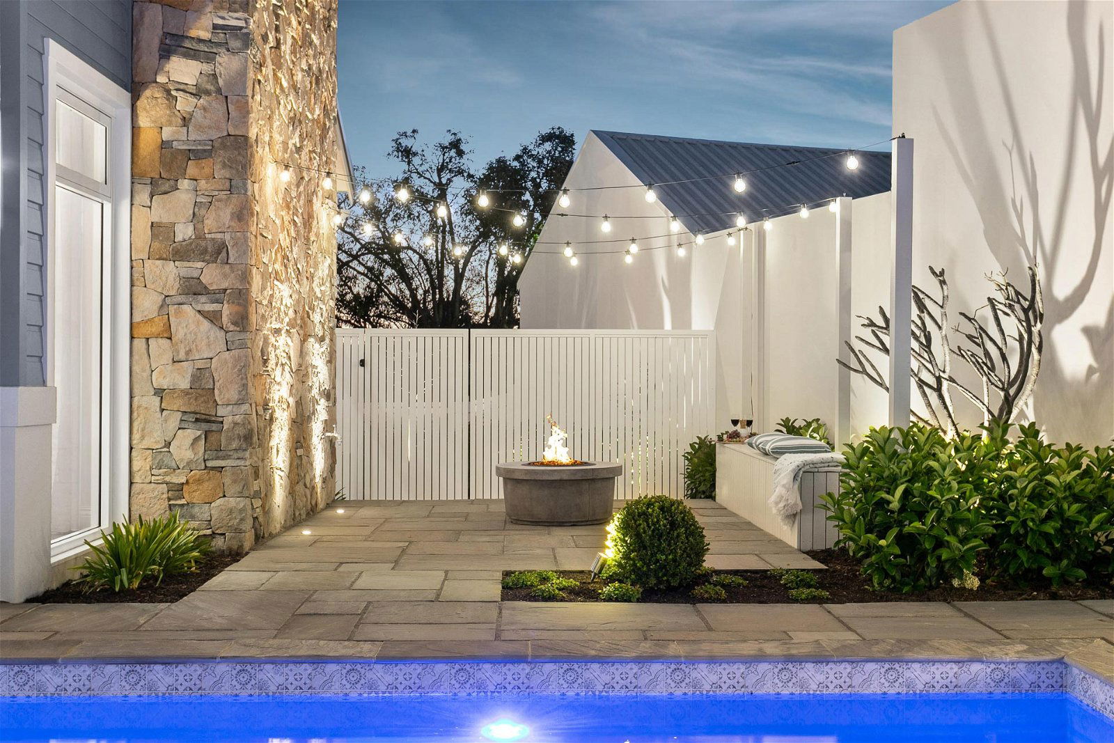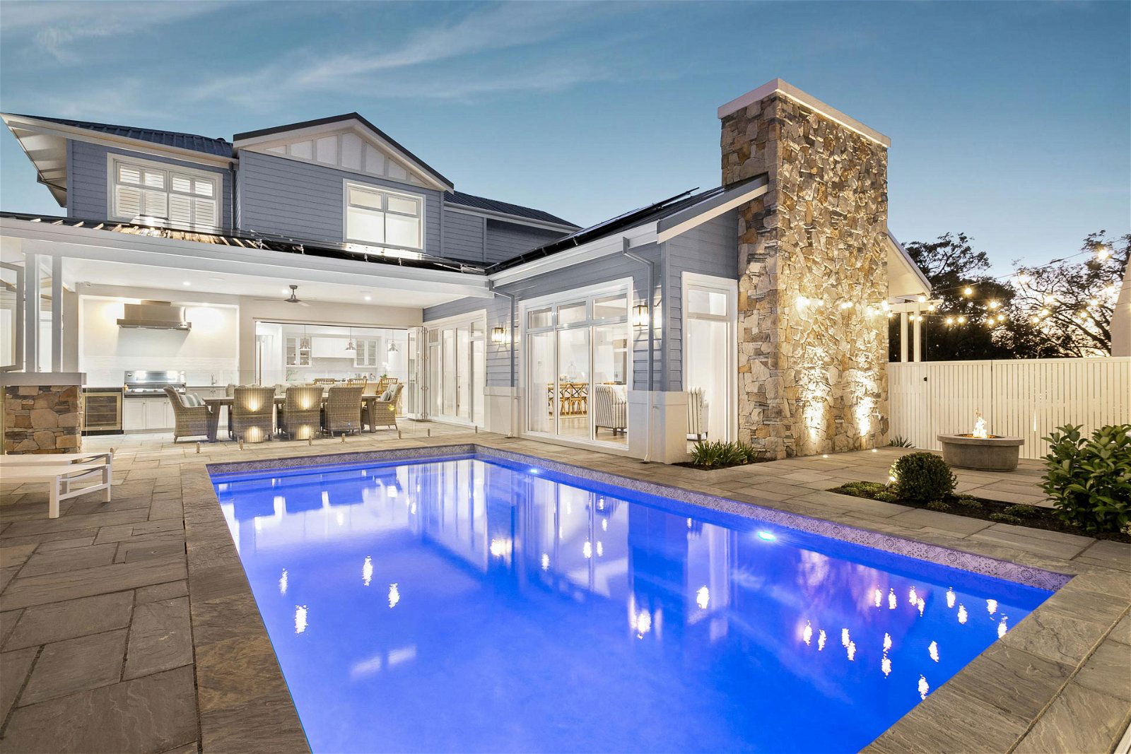 Bringing bright internal accents to life with oak flooring, raked ceilings, endless shuttered windows and a front verandah. The external stonework adds touches of charm to the front and a soaring statement stone wall to the rear that shields the fire-pit and festoon lighting.