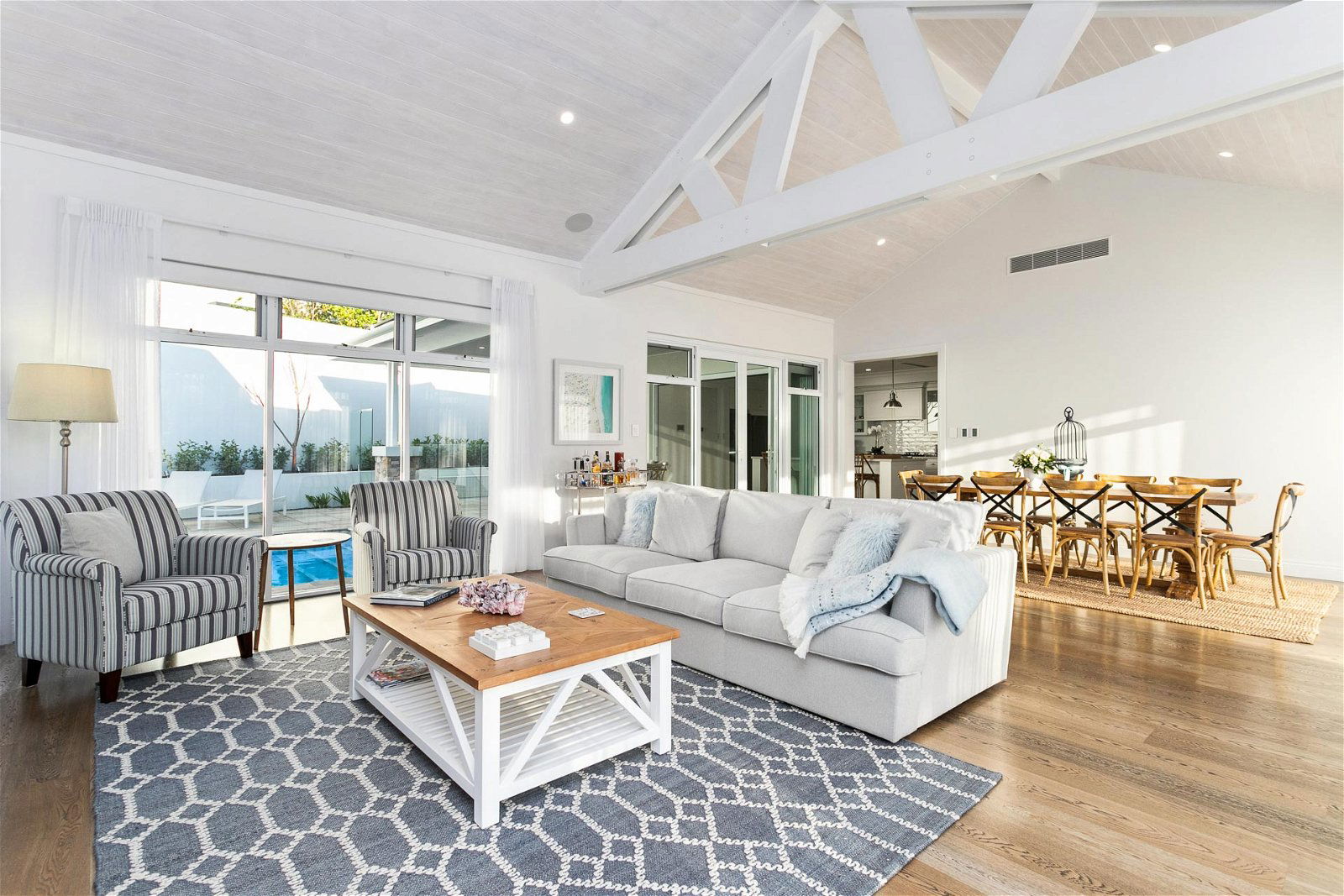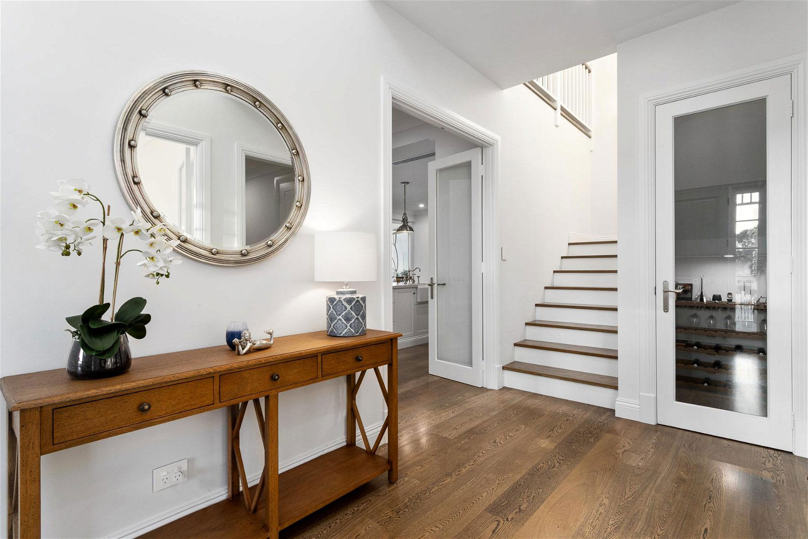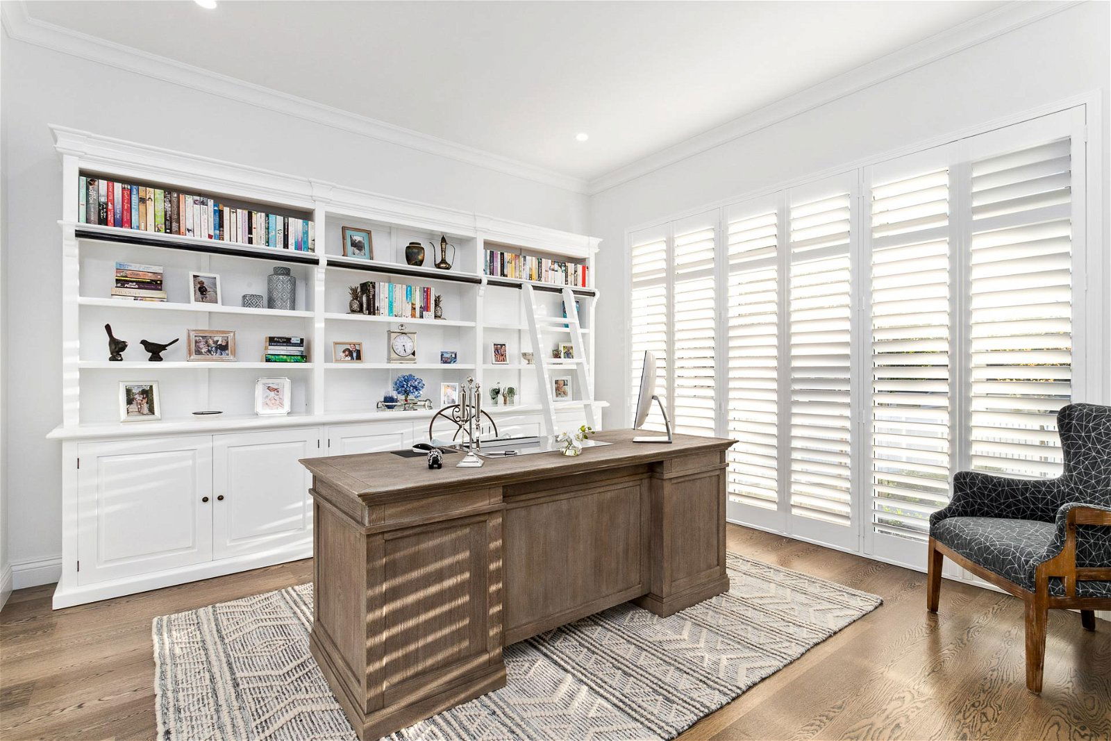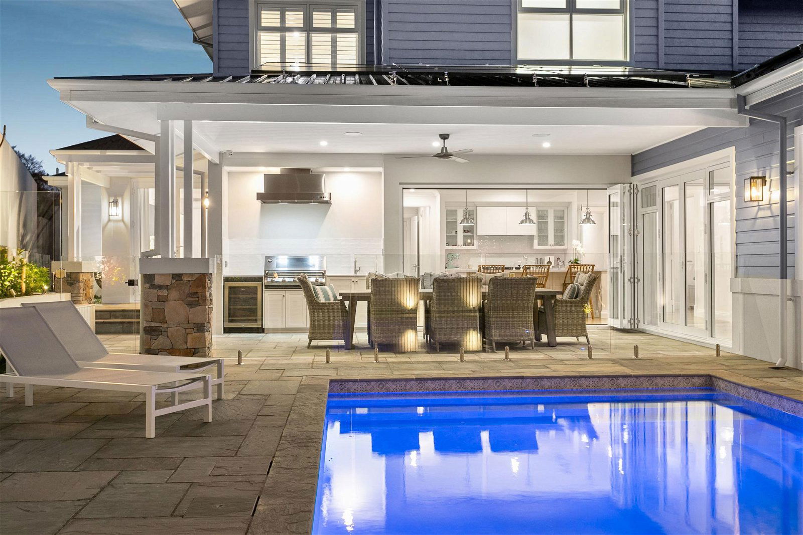 A timeless kitchen overlooks the pool and connects alfresco entertaining with expansive bi-fold doors. The decking area is fully equipped with an entertainer’s kitchen and BBQ.